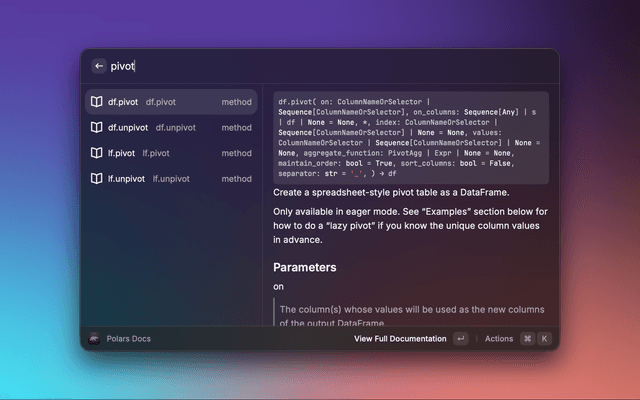 A Raycast extension that lets you search the Polars API reference and preview detailed documentation without leaving Raycast. Results include signatures, descriptions, parameters, and return values, with quick actions to open the official docs in your browser.