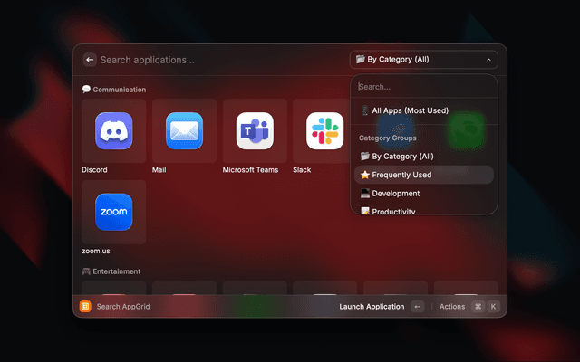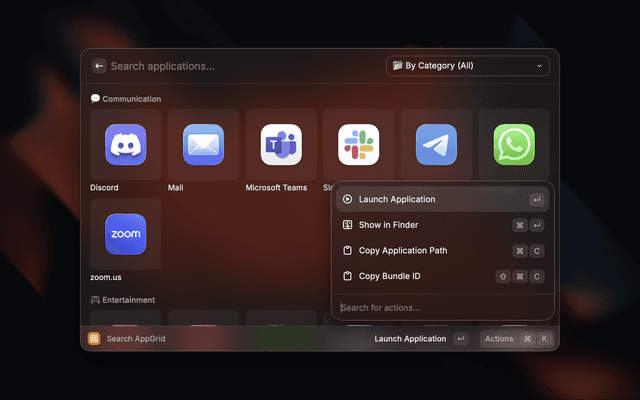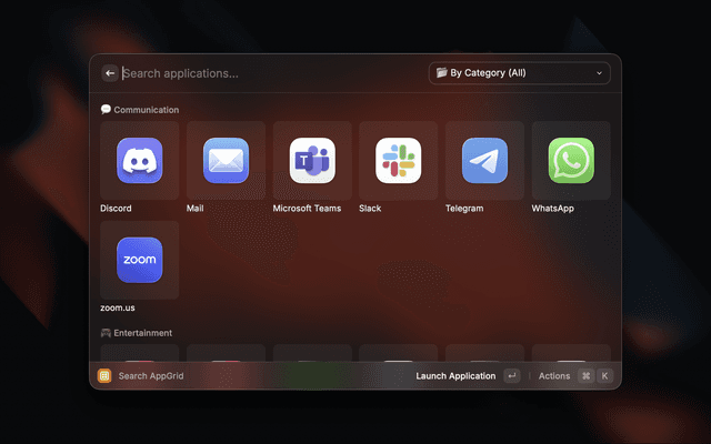 Smart app launcher for macOS with grid view and intelligent category grouping.