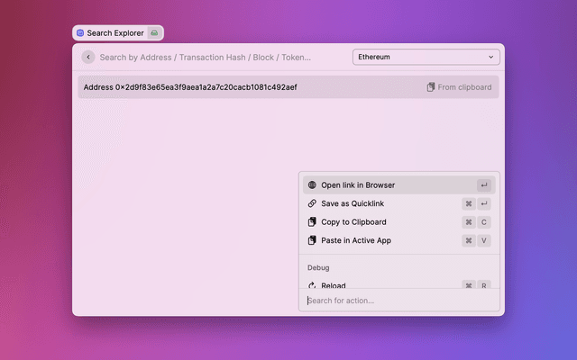 Search open links for address, transaction, block, token, and ens on Etherscan-like sites.