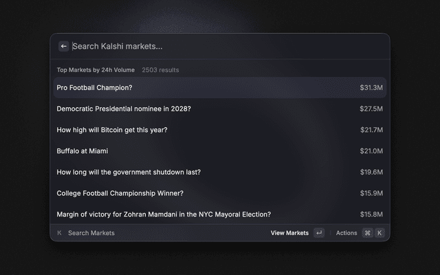 A Raycast extension for searching, browsing, and managing prediction markets on Kalshi. Quickly access trending markets, search for specific events, and keep track of your favorite markets without leaving Raycast.