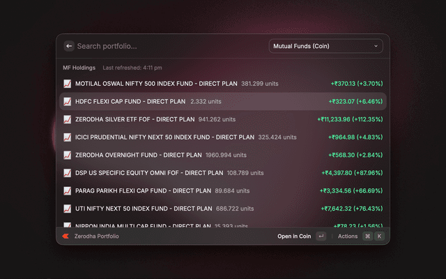 A Raycast extension to view your Zerodha portfolio — stocks from Kite and mutual funds from Coin — right from your launcher.