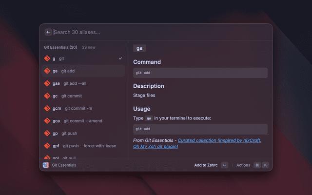 Cmd+N or click "Add New Alias"# Example: Add a quick git status alias