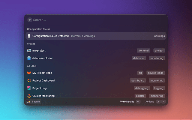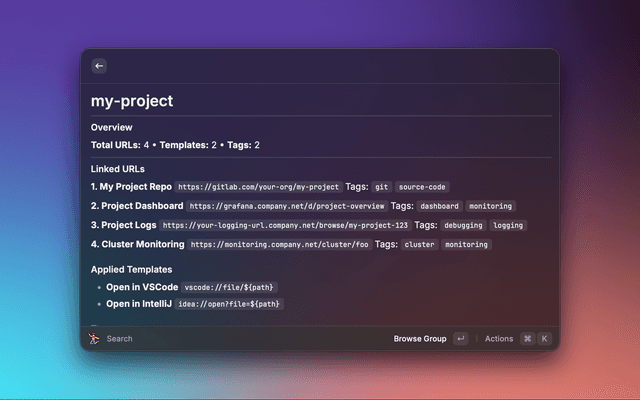 • Powerful Templating: Create dynamic URLs for common patterns (e.g., Kibana logs, Project dashboard, Git Urls) using placeholders.