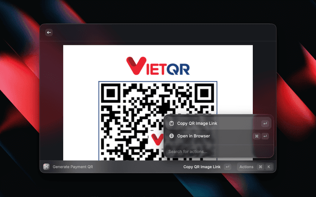 • Privacy: No financial data or account numbers are stored. All processing happens locally within Raycast and through direct API calls to VietQR.