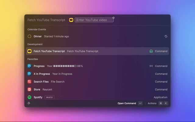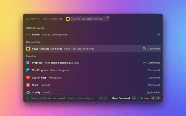 Fetch YouTube Transcript is a Raycast extension that allows you to easily fetch and save transcripts from YouTube videos.