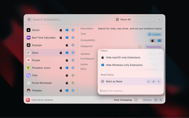 • Platform Filter Toggles — Show or hide macOS-only and Windows-only extensions directly from the action panel (cross-platform extensions are always shown)