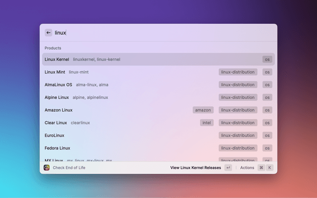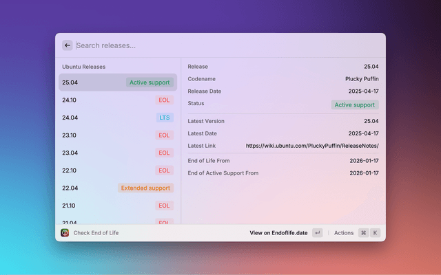 An extension to bring endoflife.date into Raycast. Get End-of-life (EOL) and support information for various products
