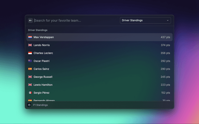 • Note: F1 does not support the favorite team dashboard command, but is still available in the preferences for use in the live scores menubar command