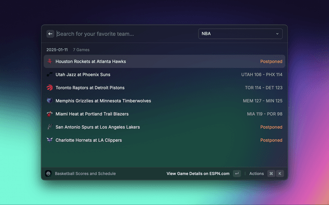 • Live Scores Command (Menubar): View live scores and upcoming games, and click on games to set them as the menu bar title, allowing users to view scores with automatic refreshes.