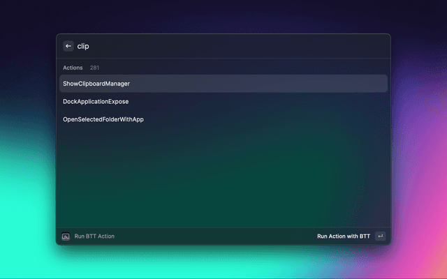 Run BTT actions from Raycast. Be sure to activate external scripting in the BetterTouchTool preferences and optionally configure a shared secret to block unauthorized applications from scripting BTT.