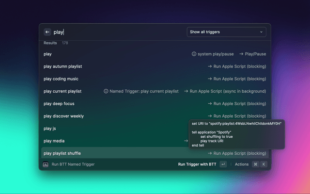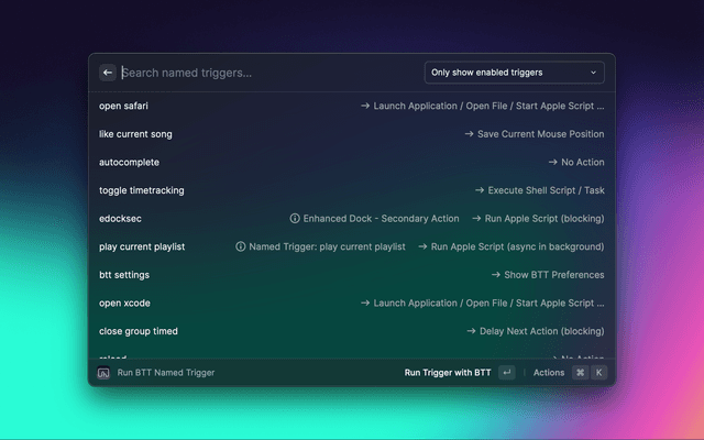 Find and run named triggers. The type of associated action will be displayed and in some cases you can hover over the action to see a preview of the code/file that will be executed.