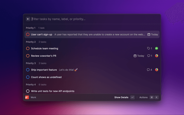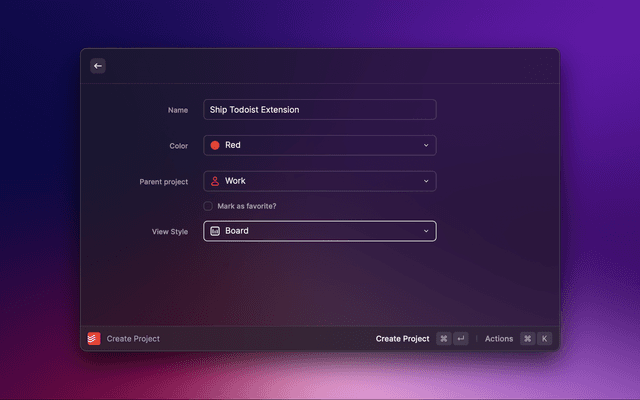 Check your Todoist tasks from within Raycast and quickly create new ones.