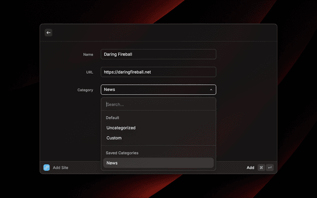 We can create a series of sites with the category “News” and then every time you want to browse your tech news sites, you can either type “news” or select the “News” category from the Category dropdown menu.