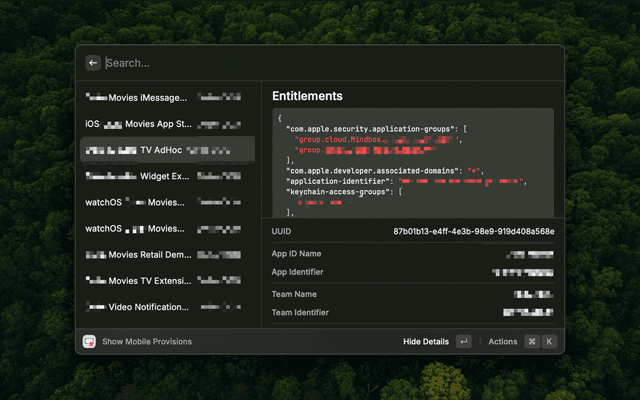 • Show Details - Toggle between list view and detailed view with entitlements, certificates, team id, and more attributes