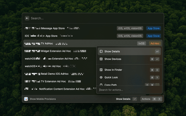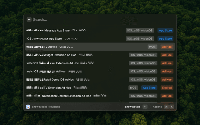 A Raycast extension that helps you manage and inspect Apple mobile provisioning profiles installed on your system. View detailed information about certificates, entitlements, provisioned devices, and more.