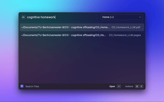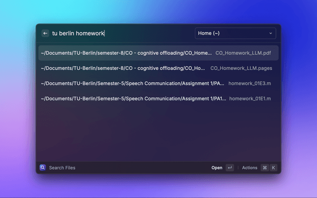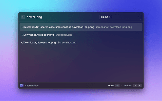 Raycast command that lets you fuzzy-find files by their full path, not only by filename. It is built for people who keep projects in deeply nested folder structures and want to jump straight to the right file.