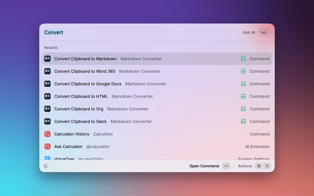 Convert between rich text, Markdown, Org-mode, and Slack formats — all from your clipboard. Works in both directions: rich text → Markdown/Org, and Markdown/Org → rich text optimized for Google Docs, Microsoft Word, Slack, and more.