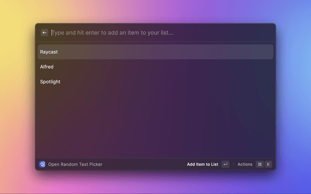 A Raycast extension to pick a random item from a list by entering multiple text inputs, ala Wheel of Names.