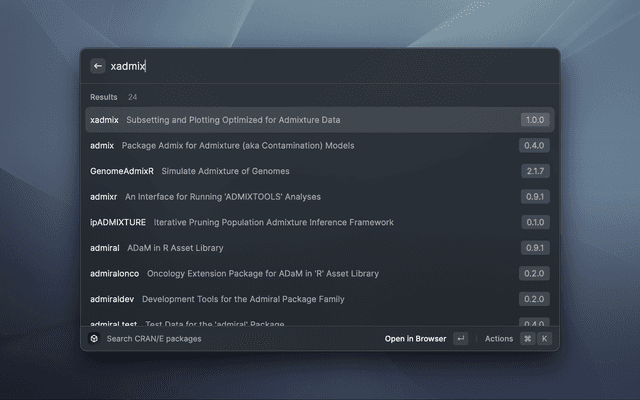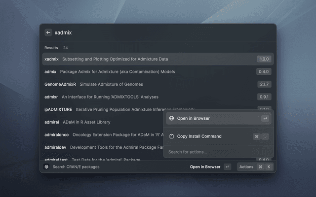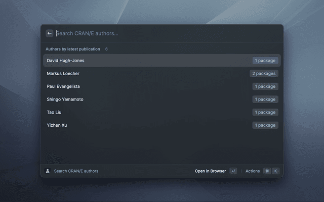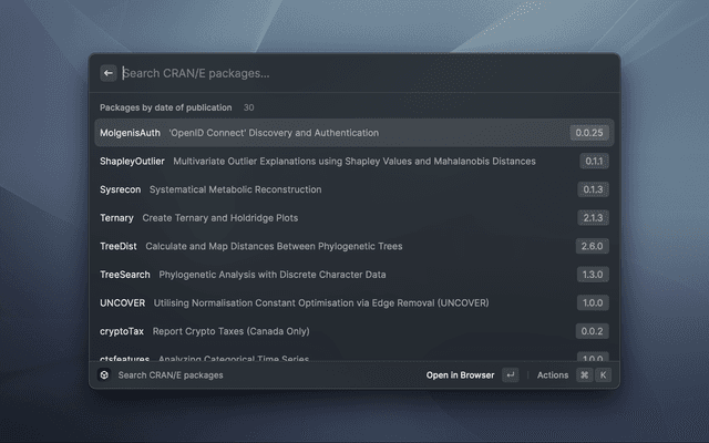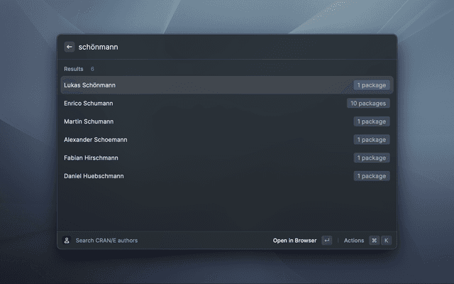 CRAN/E is a modern PWA (Progressive Web App) that serves as a search engine and information display for packages hosted on CRAN. CRAN/E means 'The Comprehensive R Archive Network, Enhanced' and aims at finding R-packages & authors as fast as possible.