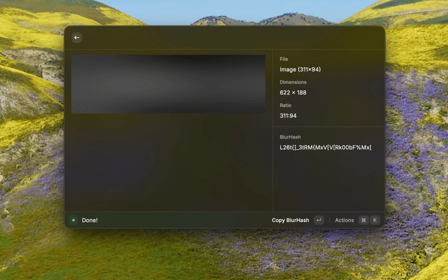 • Shows a decoded blurhash preview alongside file metadata