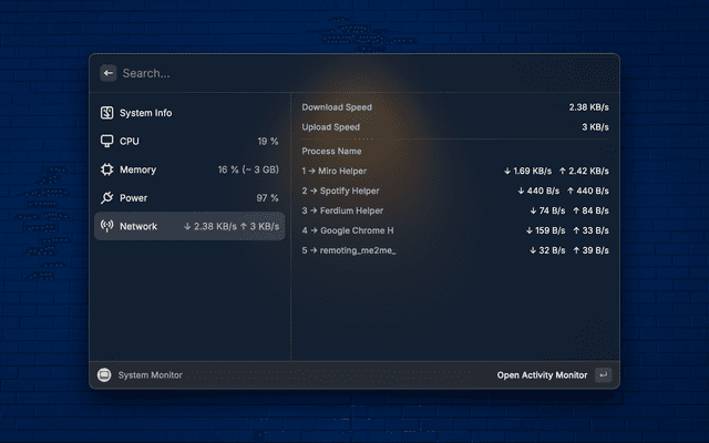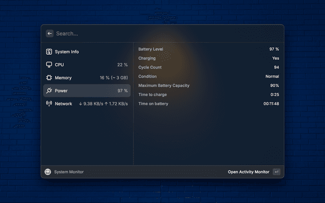 This is a Raycast extension that allows you to monitor your system's CPU, Memory, Disk and Battery usage.