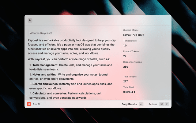 Groq's API offers a wide range of AI models, such as Mistral, Google and Meta's Llama models, with insanely fast speed (Llama3 70B with over 250 t/s). With this powerful extension, you can boost your productivity using advanced AI models without having to leave your Raycast interface.