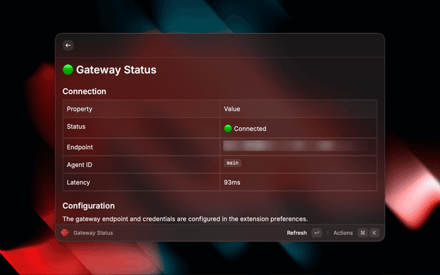 When you first run a command, Raycast will prompt for your API Endpoint and Token. The endpoint depends on where OpenClaw is running relative to Raycast: