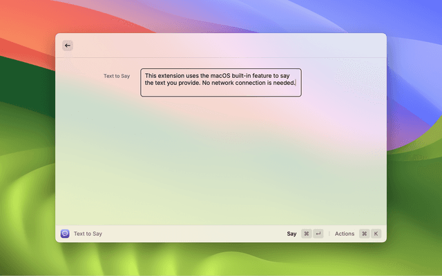 This extension uses the macOS built-in TTS (Live Speech) feature to say the text you provide. No network connection is needed.