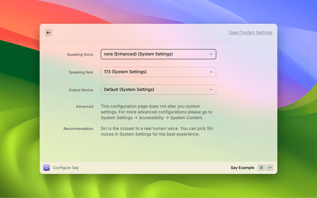 Currently, the Configure Say command we provided does not alter you system settings. You can go to your macOS System Settings to download new voices and get more advanced configurations.
