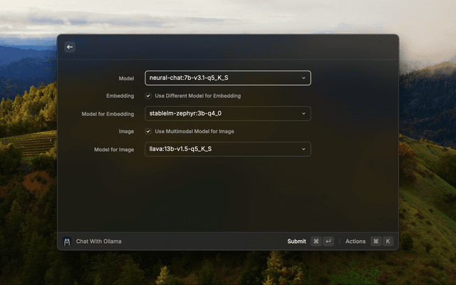 • CMD+M (macOS) CTRL+M (Windows), Change Model: change model when you want and use different one for vision or embedding.