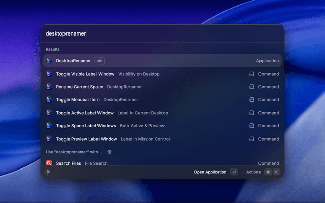 Control gitmichaelqiu's DesktopRenamer, an app that lets you rename and switch your macOS desktops, from Raycast.