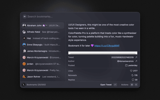 View your X/Twitter bookmarks and likes in Raycast using the bird CLI.