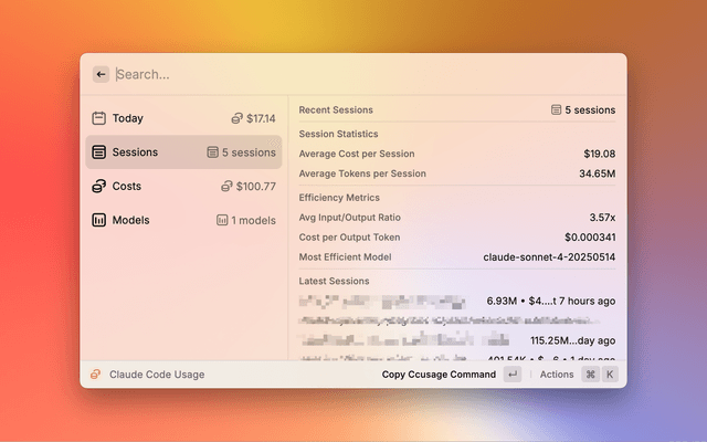 A Raycast extension that provides real-time monitoring of Claude Code usage statistics using the ccusage CLI tool.