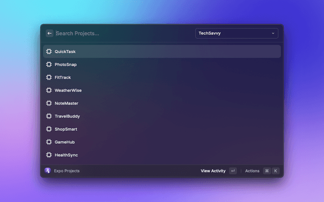 The Expo Raycast Extension allows you to manage your Expo.dev projects, Apple devices, and environment variables directly from Raycast. This extension provides a seamless way to interact with your Expo projects, view and manage Apple devices, and handle environment variables without leaving your Raycast environment.