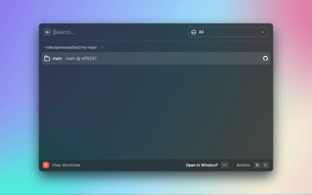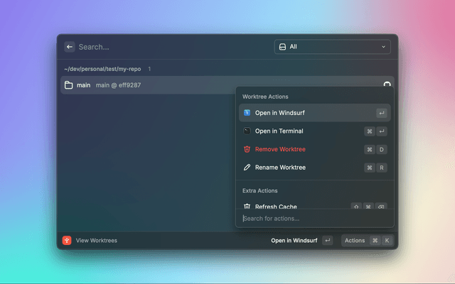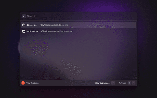 A powerful Raycast extension for efficiently managing Git worktrees with a streamlined interface. This extension helps developers work with multiple branches simultaneously by creating and managing Git worktrees through an intuitive Raycast interface.