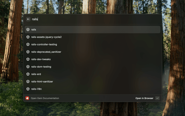 This Raycast extension is designed for companies and individuals hosting their own private Rubygems repository. It enables quick access to a specific Gem's documentation in your browser. The extension supports both private and public Gems and is configurable to suit your specific Gem repository setup.