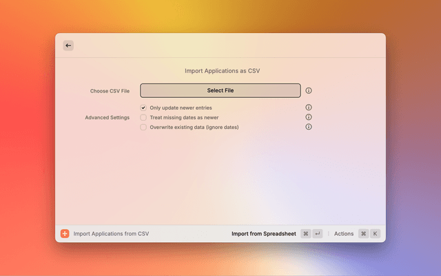 - CSV Import: Bring applications in with newer-wins conflict handling and advanced options