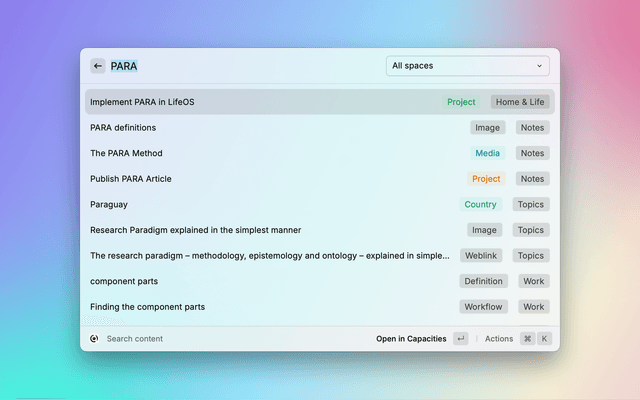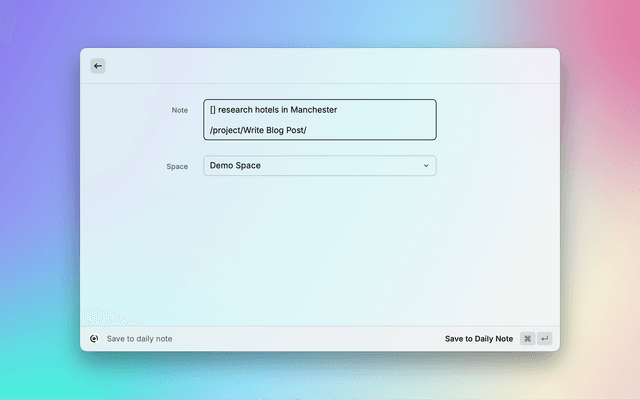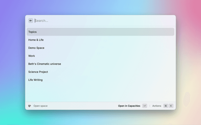 Interact with Capacities from your command bar. Search your notes, capture content & more.