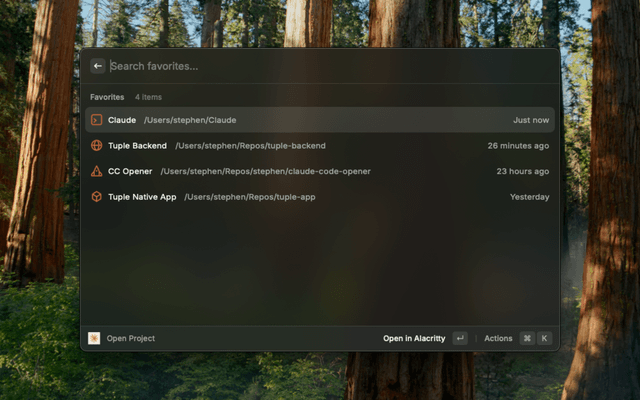 Can I use a different terminal? Supports Terminal.app, Alacritty, and Ghostty. Choose your preferred terminal in extension preferences.