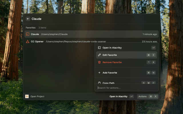 This extension lets you save your most-used project directories and open them in Claude Code with a single keystroke. No more navigating through terminal or finder - just hit your Raycast hotkey, type a few letters of your project name, and you're vibing.