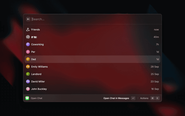 If you try to open the chat from Raycast, it'll actually open the following URL: sms://open?addresses=1234567890,9876543210 which will cause the creation of a new group chat without a name (Alice and Bob). You wouldn't want to bother your friends or family with a new group chat, would you? 😄