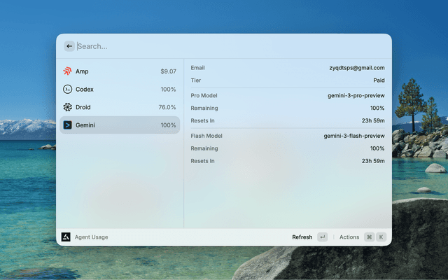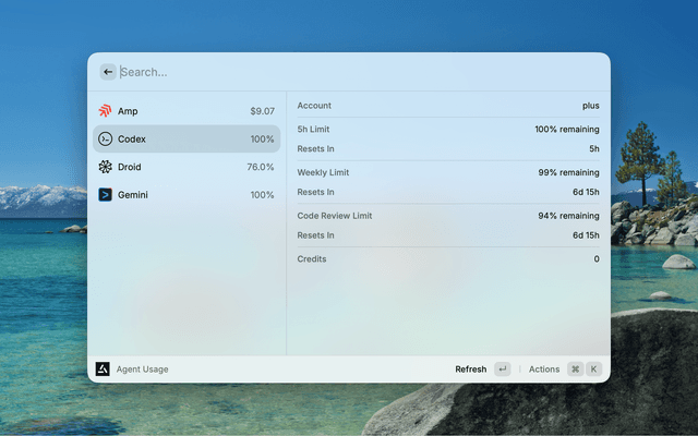 2. Open Agent Usage in Raycast — Codex usage will be auto-detected from ~/.codex/auth.json