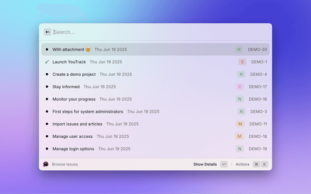 After setting up your token you should be able to browse and create YouTrack issues with Raycast 🚀.