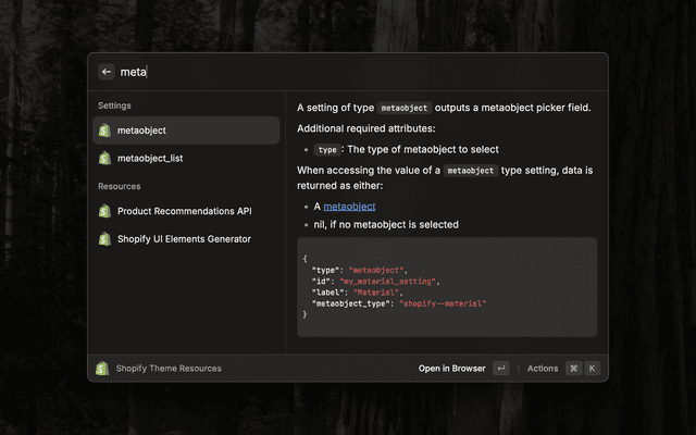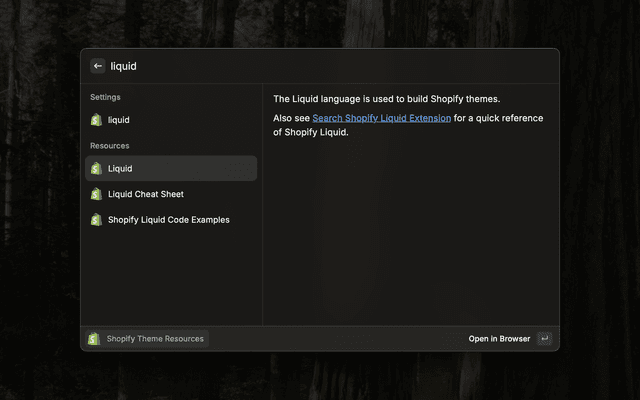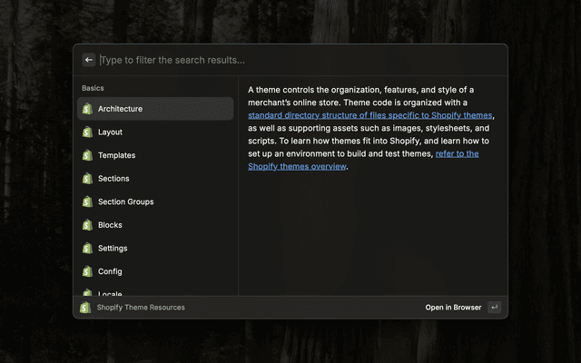 Quickly reference and search Shopify theme resources for Shopify theme development.
