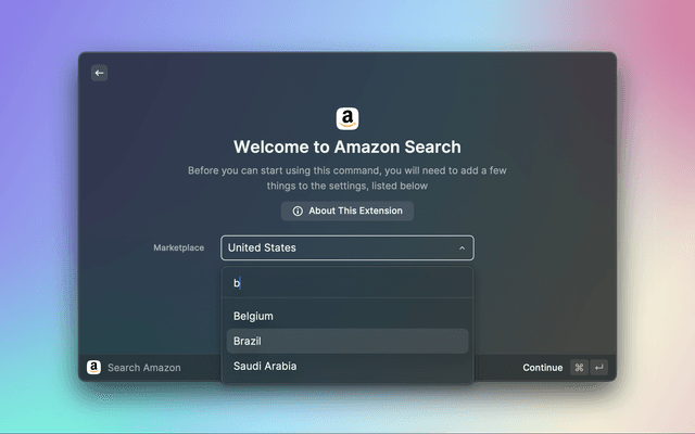 A straightforward extension that integrates Amazon's search functionality into Raycast, providing autosuggestions for an efficient product finding experience across various Amazon marketplaces.