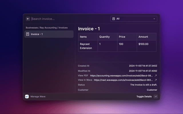This is a Raycast extension for Wave. It allows you to view your Wave Businesses and their associated Invoices, Customers and even some Customer Statements π.