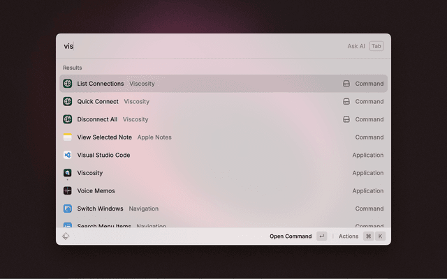 • Permissions: Raycast will request permission to control Viscosity via AppleScript the first time you run a command.