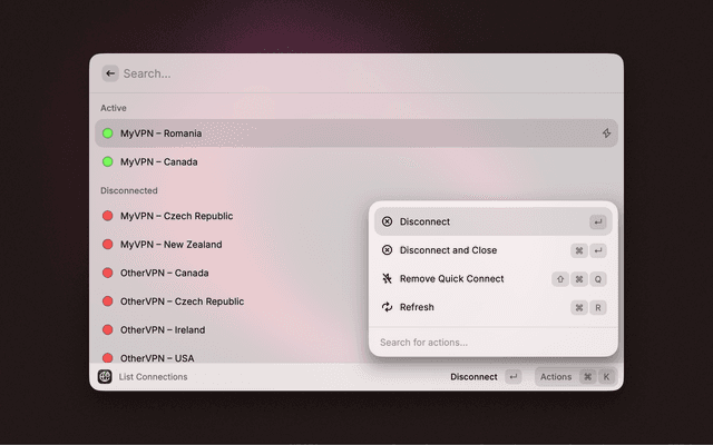 • Cmd + Shift + Q to set or remove a connection as your Quick Connect default.