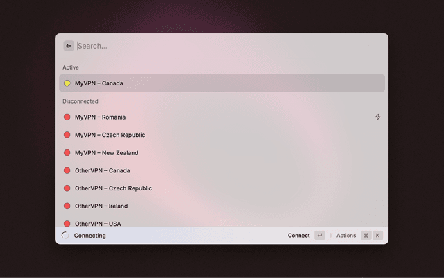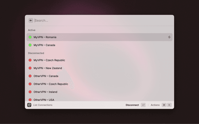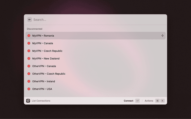 Manage your Viscosity VPN connections directly from Raycast: list, connect, and disconnect with ease.